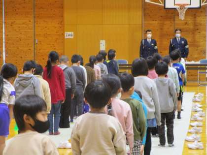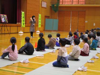 子供たちは、良い姿勢で真剣に話を聞いていました。「待つ・見る・無理しない・目立つ・もう一度見る」ことに気を付けて、これからも安全に登下校しましょう。