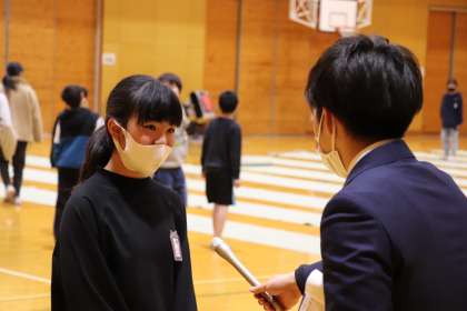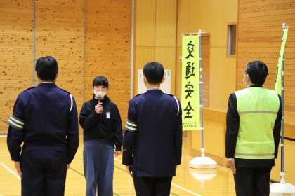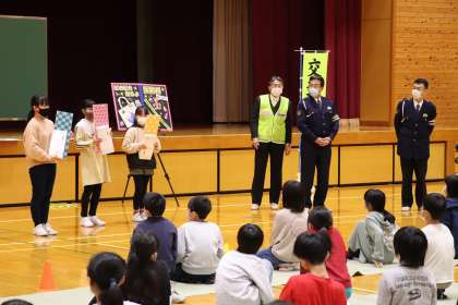 警察署の方から、交通安全に関する話を聞いた後、4〜6年生の代表児童が和柄反射材を受け取りました。また、「反射材をただ持っているだけではなく、自分の安全を守るためにも、有効に使っていきたい」と教えていただいたことを振り返りながら、代表児童が話をしました。