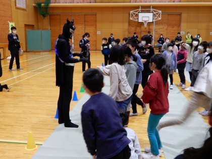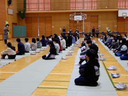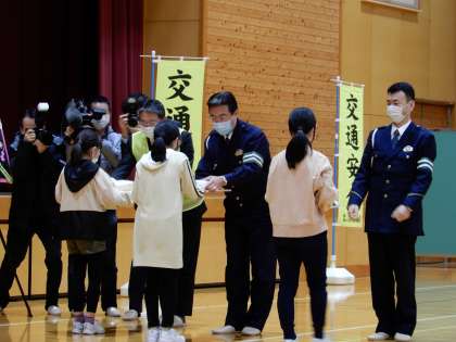 交通安全教室が行われました。警察署の方より反射材をいただき、反射材の効果について教えていただきました。