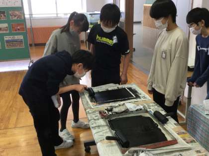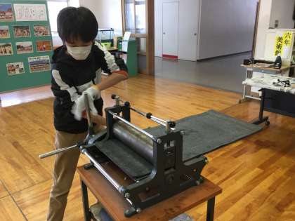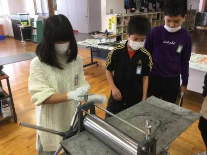 版を彫り終えた子から順番に、刷り始めました。初めて使う道具に戸惑いつつも、友達に協力してもらいながら進めていました。