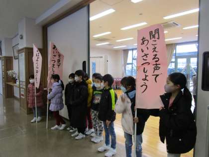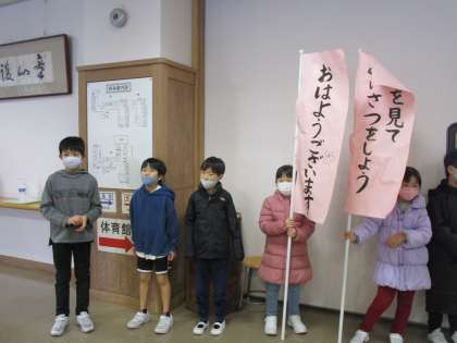 今日は、松組が玄関で挨拶運動をしました。 元気よく挨拶を交わすと、気持ちがいいですね。 月曜日は、竹組が担当です。