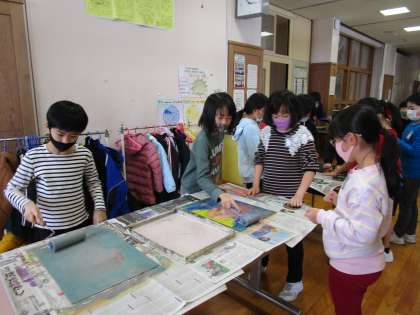 先週、ポスターカラーで色塗りした版画を今日刷りました。