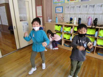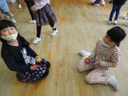 昔の遊びを楽しむ子供たちです。