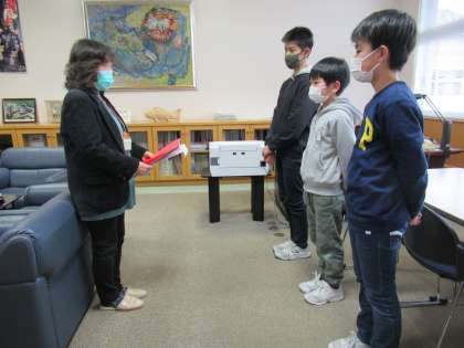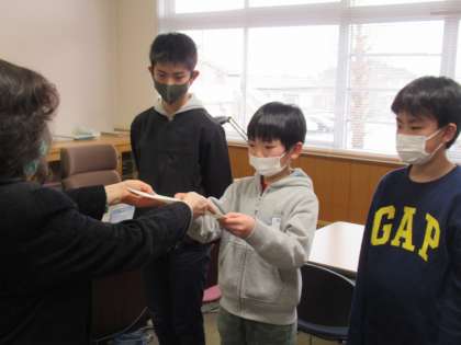書き損じ葉書収集活動への感謝状 公開日 2021/02/16 更新日 2021/02/16 委員会活動 運営委員会が呼びかけて行った書き損じ葉書の収集活動。本日、集まった葉書を富山支部の担当委員の方にお渡しし、代表児童が感謝状を受け取りました。