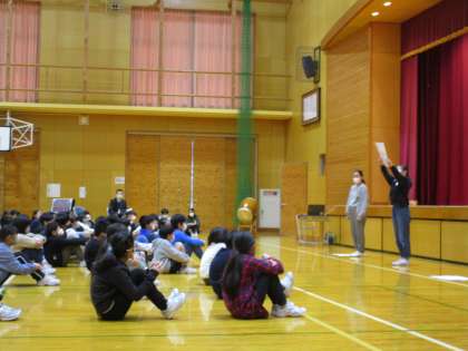 6年生が、これまであいさつ運動やファミリー活動など、最高学年として取り組んできたことを、写真やクイズなどを交えながら、分かりやすく伝えてもらいました。