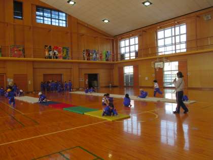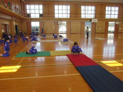 今日の体育は、マット運動をしました。マットを長くつなげて、みんなで前回りの練習です。テンポよく、グルグルと回って練習していました。