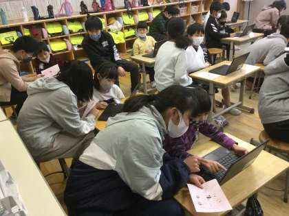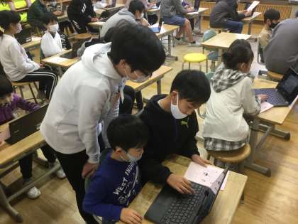PCで学校のHPを見たり、先生が事前に作成した問題に挑戦したりする1年生の活動をサポートしました。