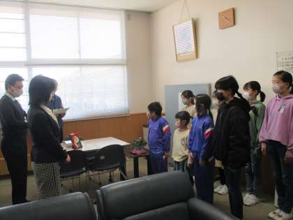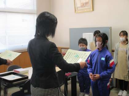 のびのびタイムに、書き初め大会の授賞式がありました。校長先生から、賞状を授与し、とても緊張したようです!