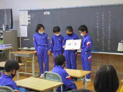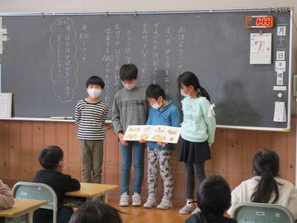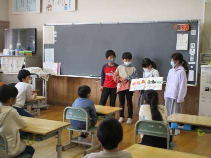 3年生 1年生に読み聞かせ 公開日 2021/03/12 更新日 2021/03/12 3年生 国語科の学習で、1年生にどんな本を紹介するとよいかグループで話合いを行いました。今週の朝学習の時間に、各グループごとに決まった本を読み聞かせしました。1年生のみんなは、喜んで聞いてくれました。
