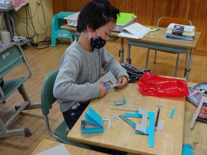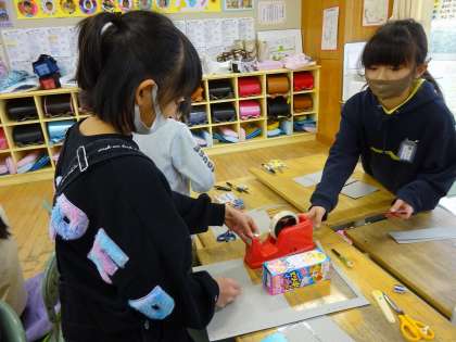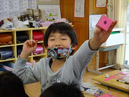 算数の学習を生かして、厚紙で思い思いの箱を作りました。大きな箱やさいころ等を作り、楽しく学習しました。