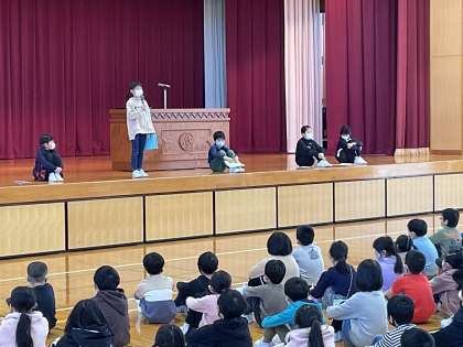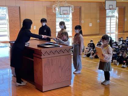 代表児童が修了証を受け取ったり、話をしたりしている様子です。
