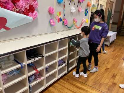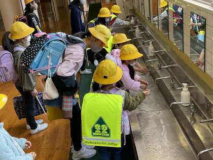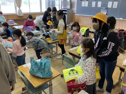 1年生教室へ行き、手を洗うように声をかけたり、ランドセルから荷物を取り出したりするサポートをしています。