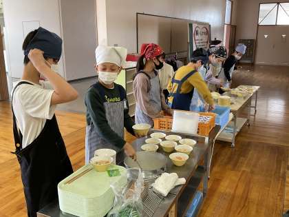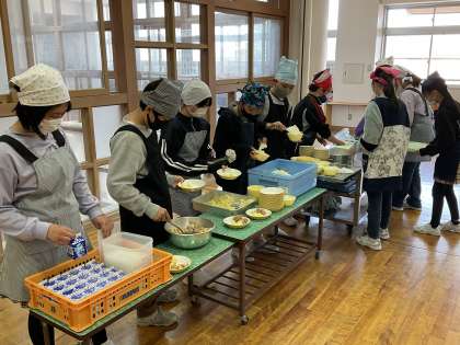 当番の子供たちが、給食の準備をしています。自分の役割を確認し、進んで取り組める姿はすばらしいです。