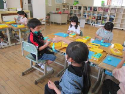 図工では粘土を握った形から自由に作品を作りました。集中して、何に見えるか考えながら作っていました。