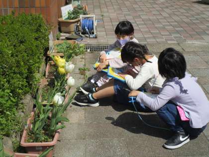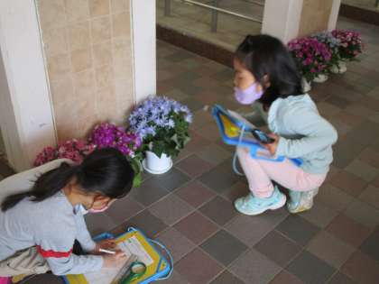 木の幹や植えてある草花等、あまりじっくり見る機会のないものをよく見て観察カードに書きました。