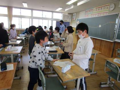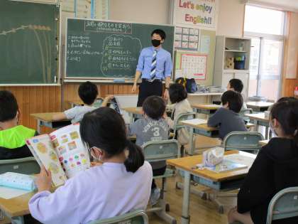外国語は、英語専科の先生と一緒に学習をしています。今日は、自分の好きな物を友達に英語で伝える学習をしました。爆弾ゲームでは、爆弾みたいなボールを持ちながら友達に好きな物を伝えていました。爆弾が爆発する前に全員が言い終われるよう、素早く伝えていました。