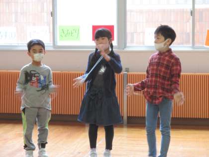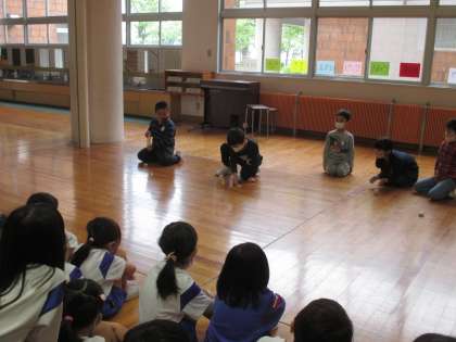 2年生 1年生と交流 その1 公開日 2021/04/28 更新日 2021/04/28 2年生 生活科の時間に、どんな2年生になりたいか話し合う中で、「1年生さんと仲良くなりたい」という意見が出てきました。そこで、まずは自分が得意なことで1年生さんと交流することにしました。今日は、音読・昔からの遊び・縄跳びグループが発表をしました。1年生さんが、目をきらきらさせて真剣に見てくれたり、拍手をしたりしてくれたので、発表した子どもたちも満足そうな表情をしていました。