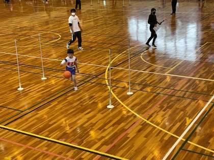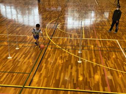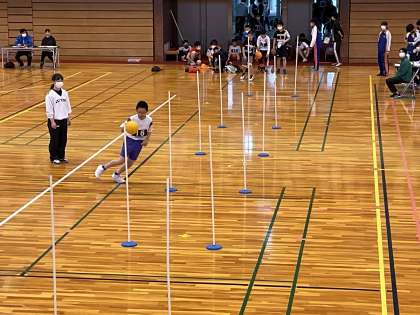 リズムよくボールの間をドリブルでかけ抜けていきます。自己ベストが出せるように、みんながんばっていました。