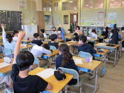 どんなクラスにしたいかをみんなで話し合いました。たくさんの人が手を挙げ、真剣な表情で意見を言っていました。