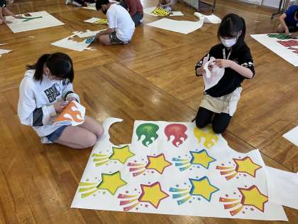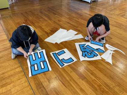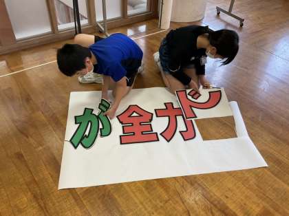 運動会に向けて、運動委員会の児童がスローガンの準備を進めています。