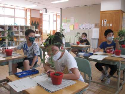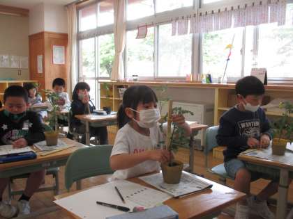 自分が選んだ野菜の苗をよく観察して、ワークシートに書きました。「もうミニトマトのにおいがする」「葉っぱに細かい毛が生えてる」などと、五感をよく働かせて観察していました。着実に「かんさつ名人」に近づいています。