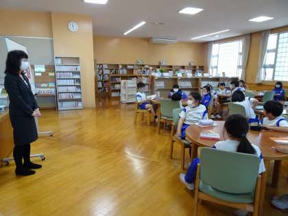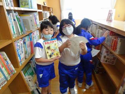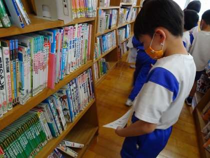 図書室の本の分類の仕方を学習しました。 本の背の情報をもとに本を見つける活動をしました。