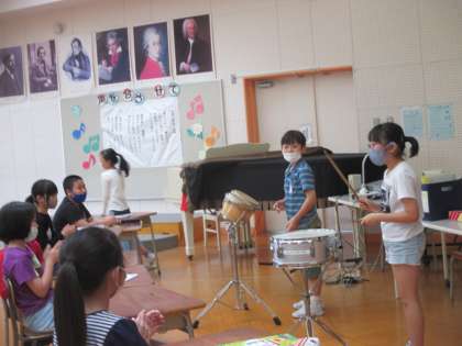 5年生 楽しくリズム打ち 松 公開日 2021/05/14 更新日 2021/05/14 5年生 今日の音楽では、色々なリズムに親しむ学習を行いました。 自分でリズムを考えたり友達の考えたリズムを打ったりしました。