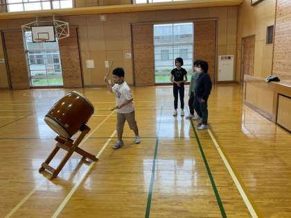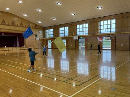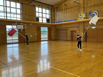 太鼓と旗手を担当する子供たちは、個別に練習しています。叩き方を見合ったり、旗の振り方を教え合ったりしています。