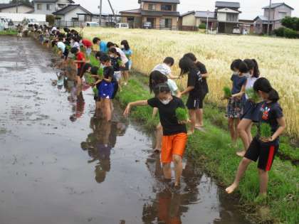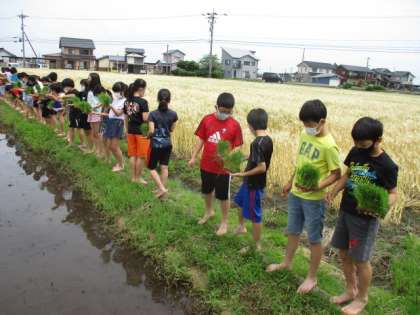 田んぼの横に一列に並び、いよいよ田植えに挑戦です。