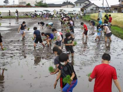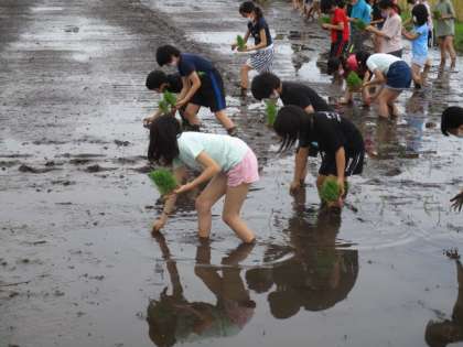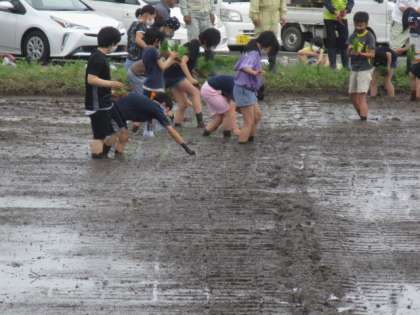 5年生 田植え 3 公開日 2021/05/24 更新日 2021/05/24 5年生 「うまく進めない」「田んぼの土ってあったかい」 「目印があると苗が植えやすいね」 田植えを通して新しい発見もできました。
