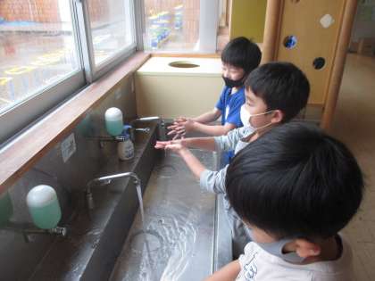 2年生 手洗い名人になろう 竹組 公開日 2021/05/24 更新日 2021/05/24 2年生 手洗いチェッカーを使って、自分の手洗いについて振り返ったり、話し合ったりしました。「指の間が洗えていない」「爪がまだよごれていたよ」とどこが洗えていないかに気づき、念入りに洗っていました。 給食前には、手洗いの歌に合わせてきれいに洗うことができていました。ご家庭でも、継続して実践できるよう、声をかけていただけるとうれしいです。