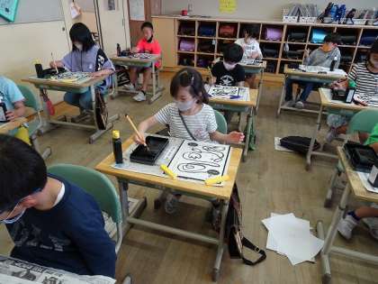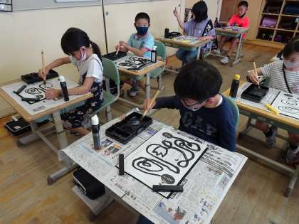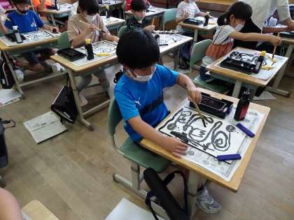 今日は、墨を使って、筆で実際に書いてみました。 一筆書きでどこまで書けるか、楽しみながら、筆遣いを確認していました。
