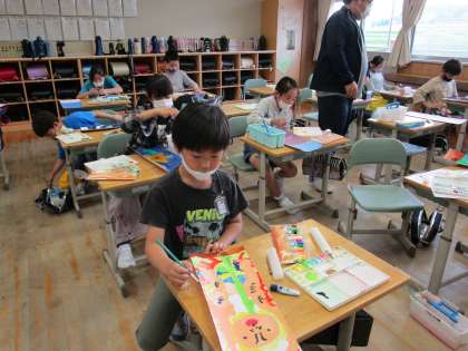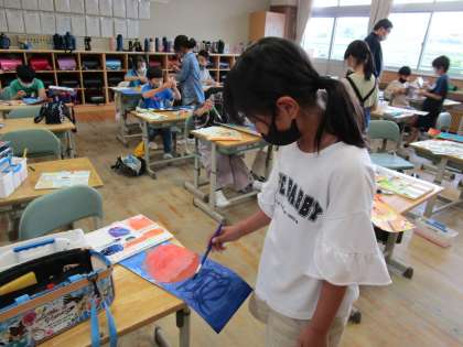 4年生 図工の学習(竹組) 公開日 2021/05/28 更新日 2021/05/28 4年生 「不思議な花」の絵を描いています。以前に学習したローラーやスタッピングの技法などを使いながら、自分のイメージに合った作品になるよう工夫しています。