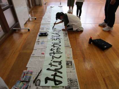 4年生 体験学習会のスローガン 公開日 2021/06/03 更新日 2021/06/03 4年生 体験学習会のスローガンが決まったので、習字の得意な子に書いてもらいました。「書いてくれる?」と聞くと大きな声で「はい」と返事し、字の形に気をつけながら、ていねいに書いてくれました。みんなから「上手だね」と言われていました。一人一人のよさをこれからも伸ばしていきたいです。