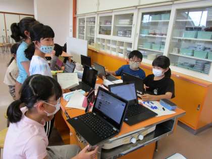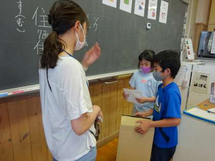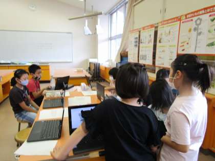体験学習会の準備をしました。ドミノチームは、ドミノになる牛乳パックが足りないことに気付き、他の学年にお願いに行きました。夕食作りチームは、焼きそばとフルーツ白玉グループに分かれて、作り方を話し合いました。ウォークラリーチームは、地図を見ながらポイントを考えました。