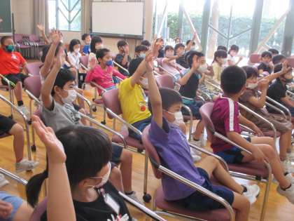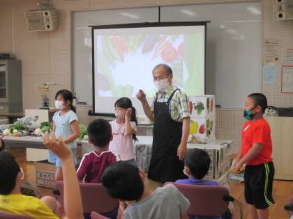 2年生 「旬の野菜や果物」に関する実感・体験学習会 公開日 2021/06/10 更新日 2021/06/10 2年生 今年度も「旬の野菜や果物」に関する実感・体験学習会を行うことができました。前回とは違った野菜が登場し、子供たちは興味津々。今回も、たくさんの野菜を直接触らせてもらったり、質問に答えていただいたりして、さらに野菜のことが好きになったようです。 給食の時間には、学んだことを思い出しながら、好き嫌いせずに食べたり、よく噛んで食べようとしたりする姿が見られました。