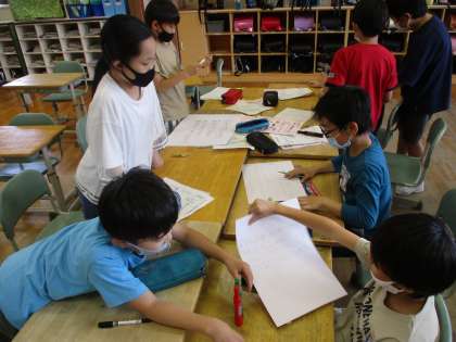 4年生 体験学習会の準備 公開日 2021/06/14 更新日 2021/06/14 4年生 金曜日に体験学習会が迫ってきました。夕食作りチームは、テーブル番号が書いてある札を作ったり、みんなの好みを聞くアンケートを作りました。ウォークラリーチームは、ポイントでのミニゲームの説明を動画で撮りました。ドミノチームは、作ったドミノのよいものを仕分けしたり、ドミノをいくつ倒せたかという記録表を作ったりました。