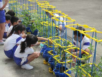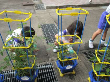 ミニトマトの実が色づき、ピーマンの実は大きく育ってきました。子どもたちは、大事に育てている野菜に心を寄せて、毎日お世話をしています。友達の野菜が元気がないと気にかけて、土をかけたり水をあげたりする姿も見られます。