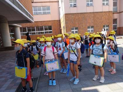 社会科校外学習に出かけました。 朝、校長先生や杉原小学校に「いってきます」のあいさつをして、出発しました。