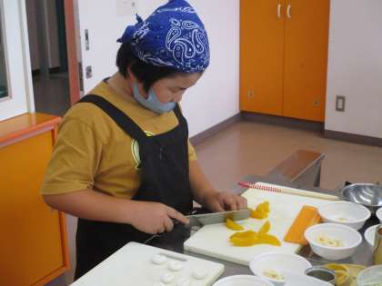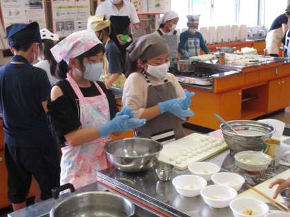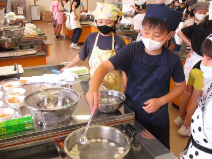 4年生 体験学習会当日(白玉フルーツ作り) 公開日 2021/06/21 更新日 2021/06/21 4年生 楽しみにしていた体験学習会の日になりました。 夕食作りでは、前半チームが、フルーツ白玉を作りました。白玉粉に水を入れてこね、約30個の玉を作り、ゆでました。フルーツを切って一緒に盛りつけました。おいしく作ろうと、班の仲間と協力していました。