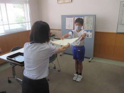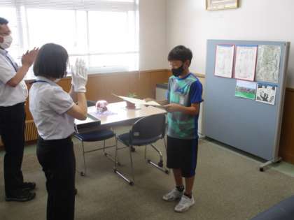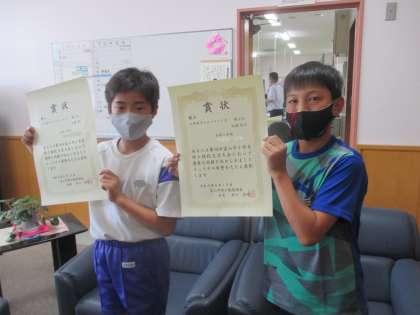 富山市の陸上大会の表彰式が校長室で行われました。 2人は、7月4日の富山県の陸上大会に出場します。