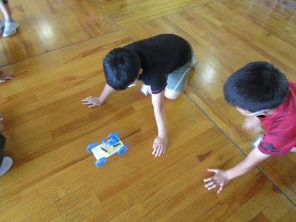 今日は、電気のはたらきの学習で、モーターと乾電池を使って車を走らせました。