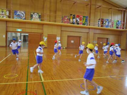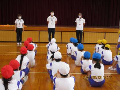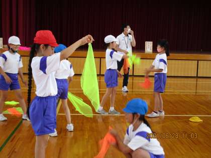 講師の方に来ていただいて体育の時間にコオデネーショントレーニングの学習をしました。寝転んだ姿勢から素早く立ったり、置いてある輪を踏まないように進んだり、スカーフを友達に落としてもらって素早くキャッチしたりといろいろな運動に取り組みました。常に動き回って、たっぷり運動ができました。