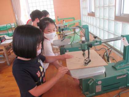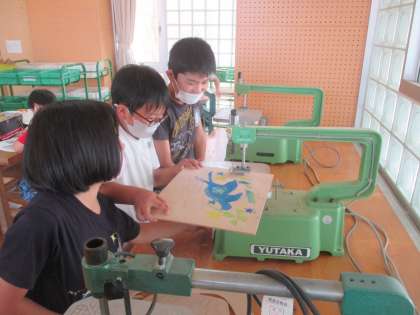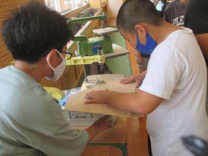 5年生 図工 糸のこすいすい 松組 公開日 2021/06/30 更新日 2021/06/30 5年生 図工では、伝言板づくりをしています。 糸のこを動かしながら、自分の思う形に板を切りました。 友達と助け合いながら、作品作りに取り組んでいます。