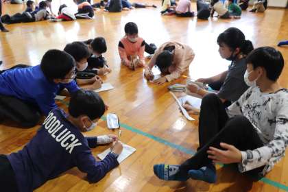 午後は2日間の活動の振り返りをしました。自分の目当てがどこまで達成できたか考えて書いたり、班の仲間と話したりしました。