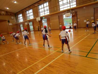 今日の体育は、タグをつけてお手玉を持ち、タグを取ろうとする相手の団をかわし、ゴールのかごにお手玉を入れたら大成功になるゲームをしました。2つともタグを取られたら、おしまいです。右に左に相手を揺さぶる作戦や後ろからこっそり迫る作戦、おとり作戦等、どうしたらお手玉を最後まで運べるかを考え、実行することができました。