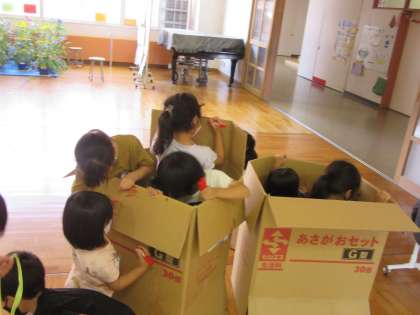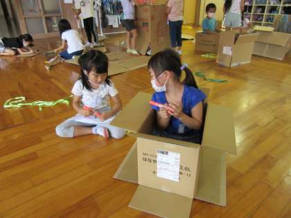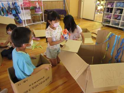 段ボールや空き容器を使い、来週のがんばったね集会に向けて準備中です。