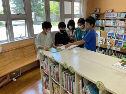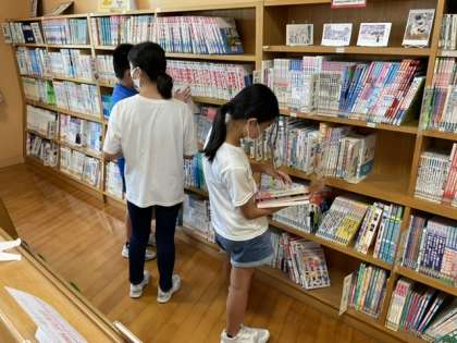 夏休みに向けて、図書室で本を選んでいます。これまでに読んだことがない本や気になっていた本など、どれにしようか手に取りながら考えているようでした。