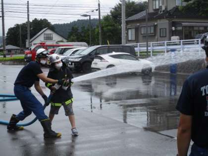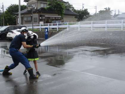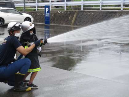 放水体験では実際の防火服に着替えて、放水を行いました。