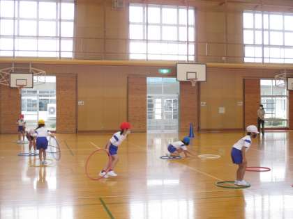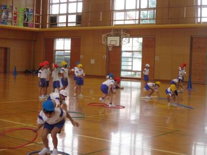 体育ではフラフープを回したり、転がしたり、フラフープ渡りリレーをしたりしました。難しい動きにも楽しく挑戦していました。